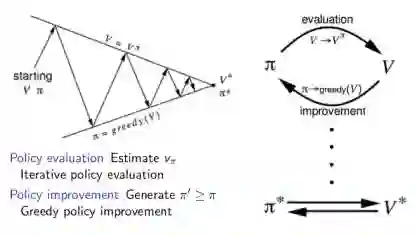 在当前策略上迭代计算v值,再根据v值贪婪地更新策略,如此反复多次,最终得到最优策略 和最优状态价值函数