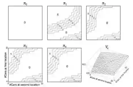 举了一个汽车租赁的例子,说明如何在给定策略下得到基于该策略的价值函数,并根据更新的价值函数来调整策略,直至得到最优策略和最优价值函数。
