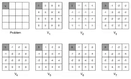 简要思路:在已知左上角为最终目标的情况下,我们可以从与左上角相邻的两个方格开始计算,因为这两个方格是可以仅通过1步就到达目标状态的状态,或者说目标状态是这两个状态的后继状态。最短路径可以量化为:每移动一步获得一个-1的即时奖励。为此我们可以更新与目标方格相邻的这两个方格的状态价值为-1。如此依次向右下角倒推,直至所有状态找到最短路径。