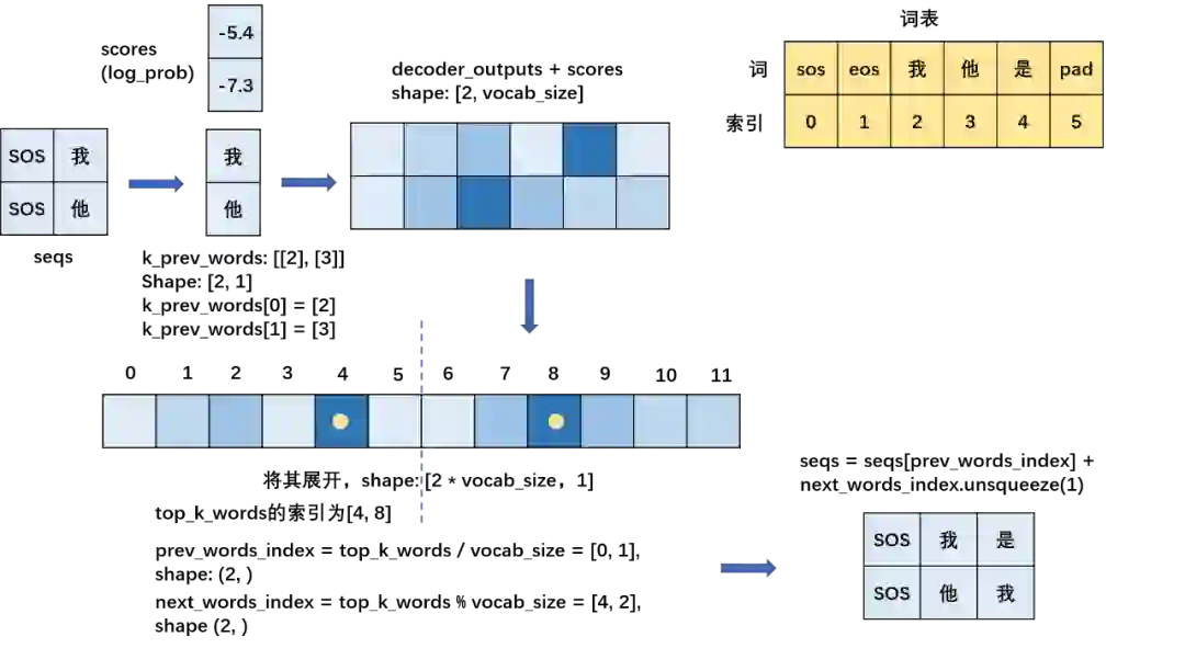 具体来说,我们先将sos token复制k次,组织成(k, 1)的形状,送入decoder,得到形如(k, vocab_size)的logit值(经过log_softmax后),与之前保存的log_prob向量相加后,将其展开为(k*vocab_size, 1)的形状(方便直接找到topk大的值的索引)。执行topk后得到的索引可以同时求出前一个时刻的单词索引向量prev_words_index (形状为(k))和当前需要输出的单词索引向量next_words_index (形状为(k)),满足下列关系: