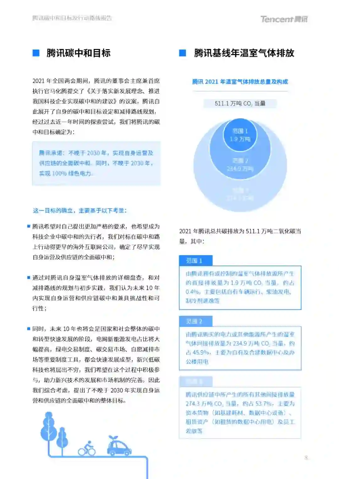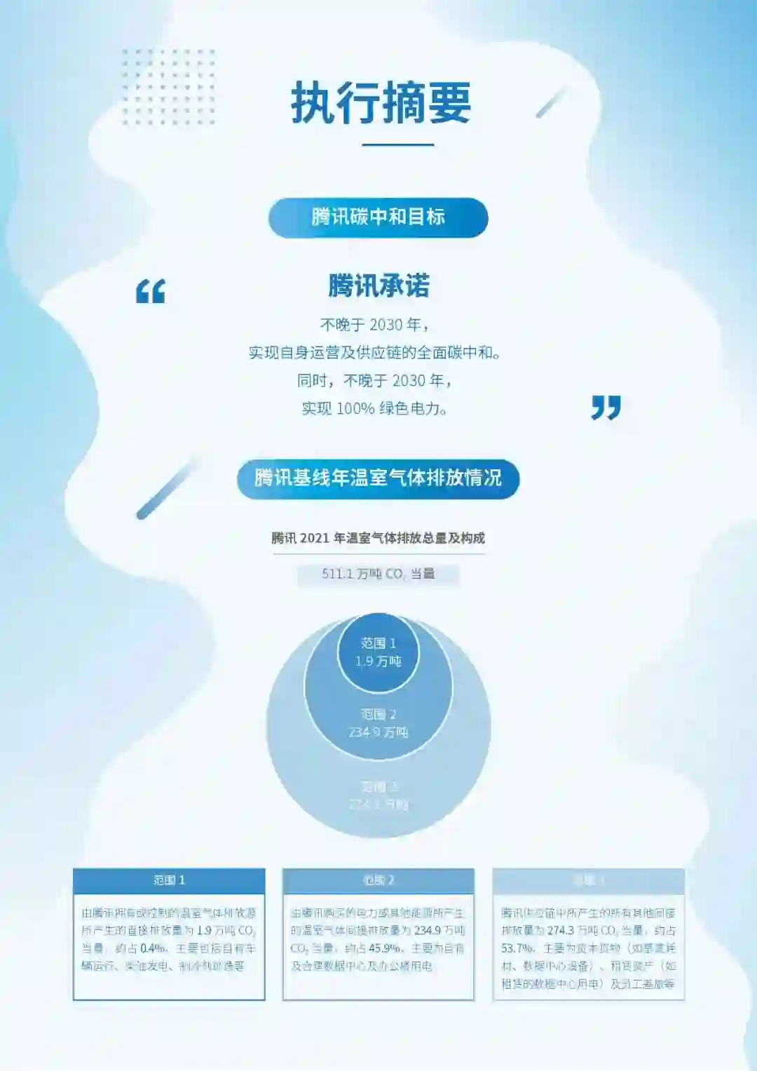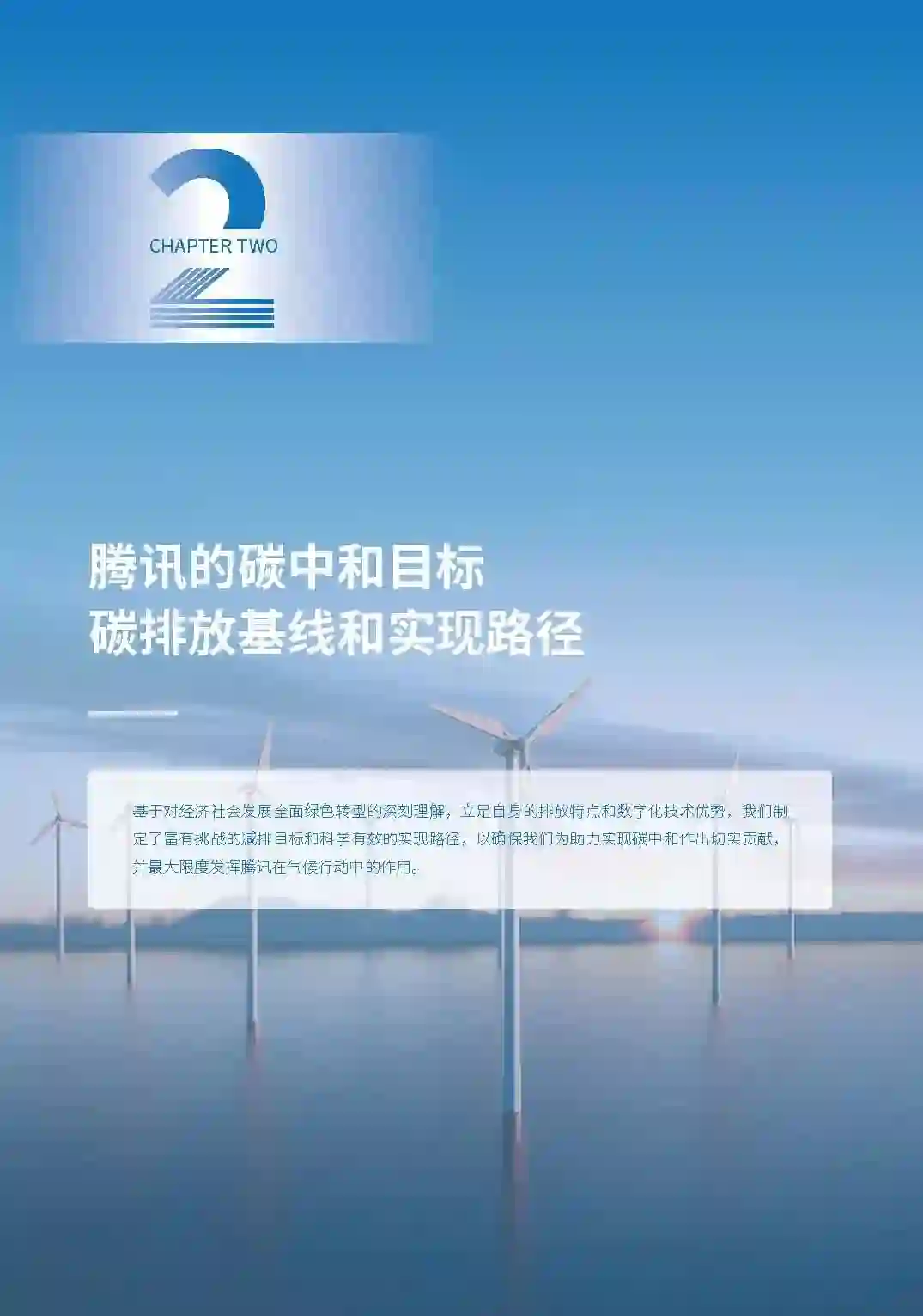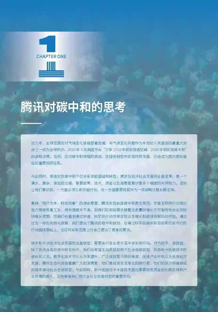 近几年,全球范围应对气候变化进程显著加速,将气候变化问题作为本世纪人类面临的最重大挑 战之一成为全球共识,2020 年 9 月我国作出“力争 2030 年前实现碳达峰、2060 年前实现碳中和” 的战略决策。当前,应对碳中和领域的挑战,在绿色转型中实现共同发展,已经成为国内国际面 临的重要共同任务。与此同时,推进实现碳中和不仅关系到能源结构转型,更涉及经济社会发展的全面变革,是一个 漫长、复杂、深远的过程,需要政策、技术、资金以及消费者意识等多个维度的共同努力。这些 让我们意识到,一方面必须立即开始行动,另一方面需要将其作为一项战略议题长期坚持。秉持“用户为本,科技向善”的使命愿景,腾讯实现自身碳中和责无旁贷。尽管互联网行业相比 电力钢铁等重工业,排放强度并不高,但我们的用能需求随着业务量的增长不可避免地会出现较 快增长预期,而我们也看到通过快速、科学的行动尽早实现业务增长和碳排放脱钩的可能。通过过去一年的实践与探索,我们提出了腾讯的碳中和规划,在确立科学的碳中和目标和切实可行的 行动路线基础上,还在时间和范围上对自己提出了更高的要求。碳中和关涉经济社会发展的全面转型,需要各行各业参与其中并采取行动。作为助手、连接器, 除了完成自身的碳中和目标外,我们也希望主动承担起助力社会低碳转型、扶持新兴低碳技术的 使命和义务。数字化技术可以从效率提升、广泛连接等不同的角度,促进产业升级以及低碳经济 发展;腾讯生态内连接着最广大的消费者,他们是低碳生活理念的践行者,他们的努力将直接或 间接地推动社会低碳转型;与此同时,新兴低碳技术本身的发展也需要研发资金的长期支持和产 业环境的孵化,这些都是我们助力全社会低碳转型的重要方向。