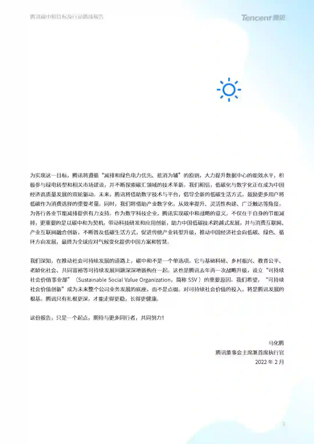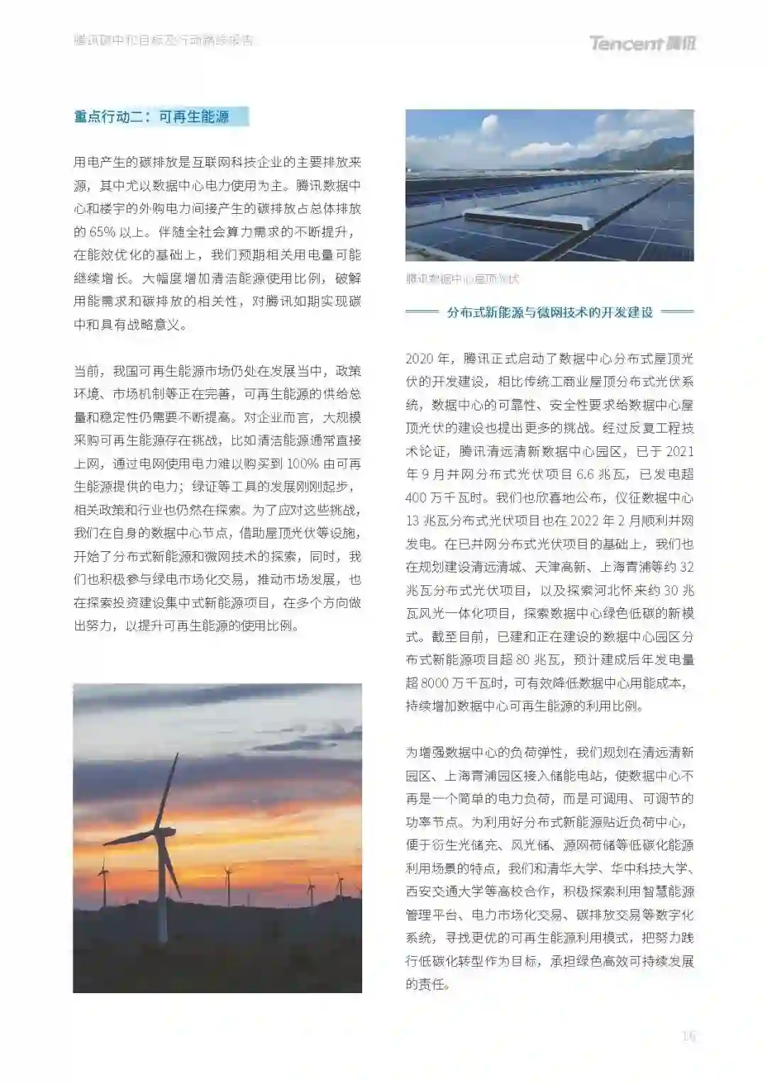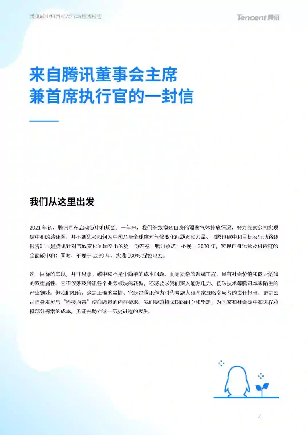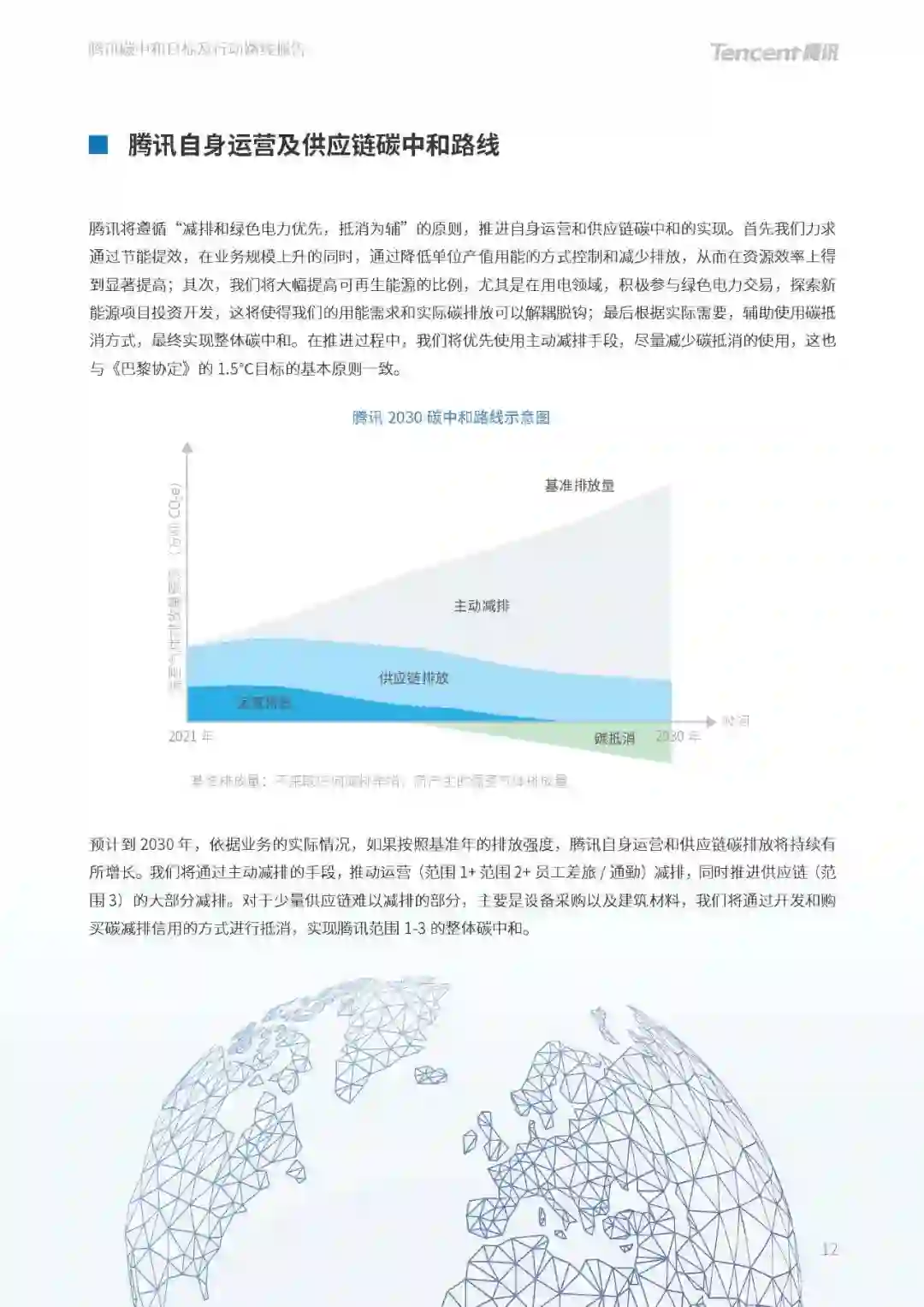 近几年,全球范围应对气候变化进程显著加速,将气候变化问题作为本世纪人类面临的最重大挑 战之一成为全球共识,2020 年 9 月我国作出“力争 2030 年前实现碳达峰、2060 年前实现碳中和” 的战略决策。当前,应对碳中和领域的挑战,在绿色转型中实现共同发展,已经成为国内国际面 临的重要共同任务。与此同时,推进实现碳中和不仅关系到能源结构转型,更涉及经济社会发展的全面变革,是一个 漫长、复杂、深远的过程,需要政策、技术、资金以及消费者意识等多个维度的共同努力。这些 让我们意识到,一方面必须立即开始行动,另一方面需要将其作为一项战略议题长期坚持。秉持“用户为本,科技向善”的使命愿景,腾讯实现自身碳中和责无旁贷。尽管互联网行业相比 电力钢铁等重工业,排放强度并不高,但我们的用能需求随着业务量的增长不可避免地会出现较 快增长预期,而我们也看到通过快速、科学的行动尽早实现业务增长和碳排放脱钩的可能。通过过去一年的实践与探索,我们提出了腾讯的碳中和规划,在确立科学的碳中和目标和切实可行的 行动路线基础上,还在时间和范围上对自己提出了更高的要求。碳中和关涉经济社会发展的全面转型,需要各行各业参与其中并采取行动。作为助手、连接器, 除了完成自身的碳中和目标外,我们也希望主动承担起助力社会低碳转型、扶持新兴低碳技术的 使命和义务。数字化技术可以从效率提升、广泛连接等不同的角度,促进产业升级以及低碳经济 发展;腾讯生态内连接着最广大的消费者,他们是低碳生活理念的践行者,他们的努力将直接或 间接地推动社会低碳转型;与此同时,新兴低碳技术本身的发展也需要研发资金的长期支持和产 业环境的孵化,这些都是我们助力全社会低碳转型的重要方向。