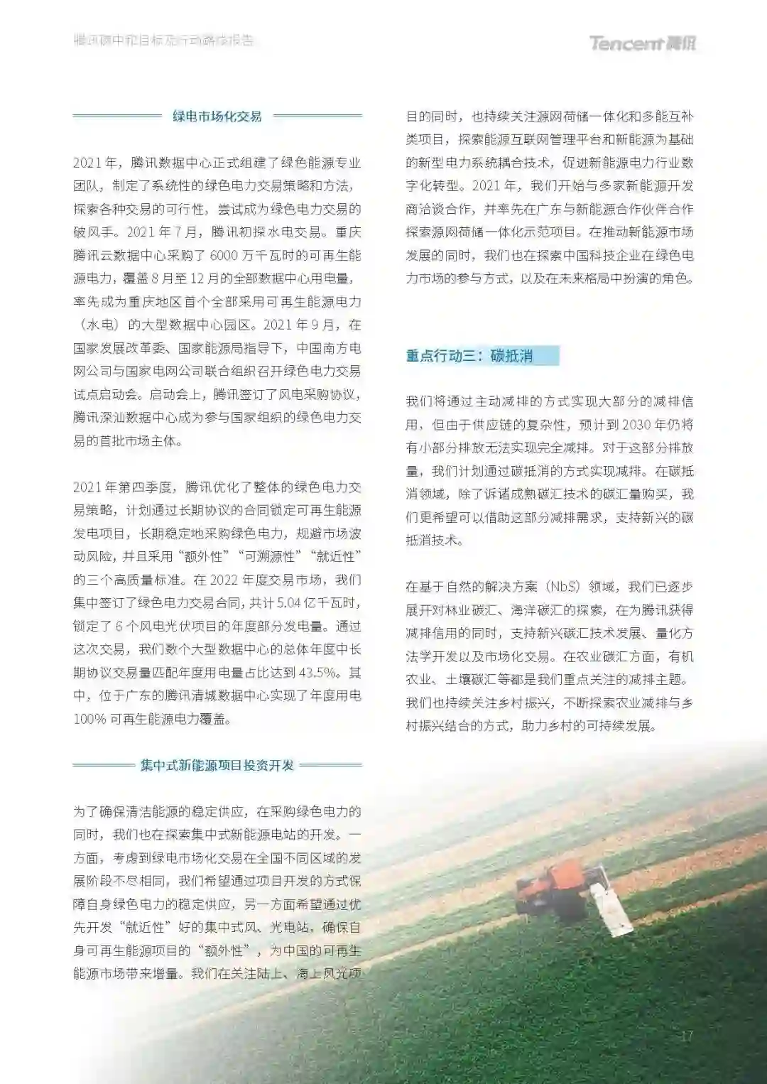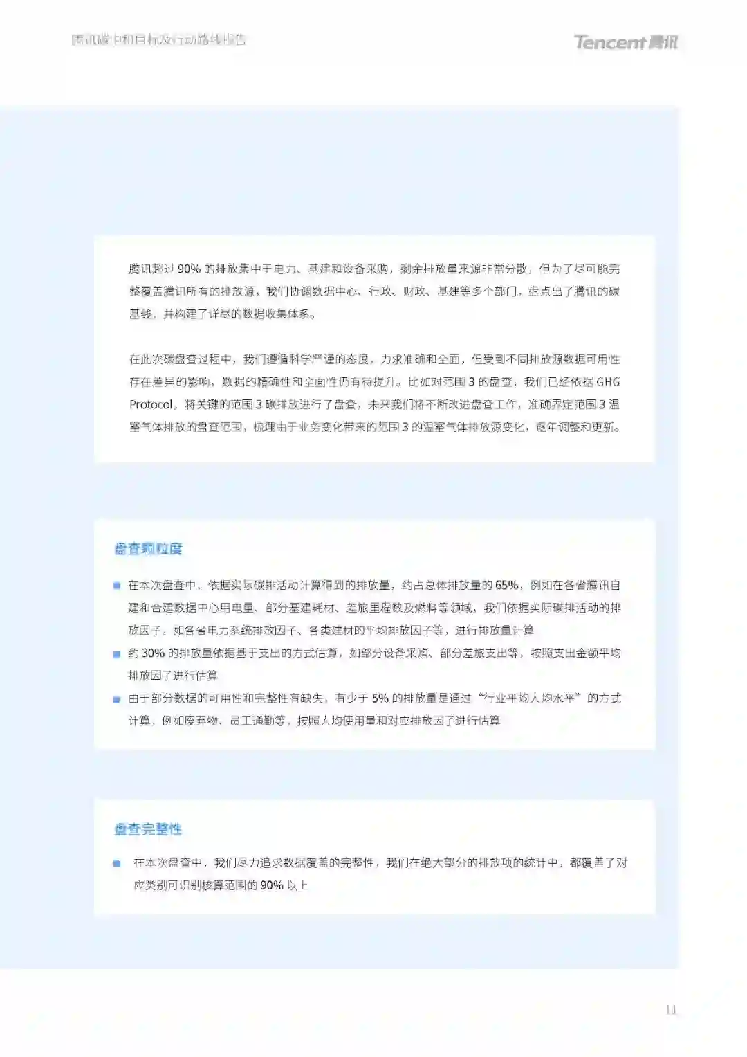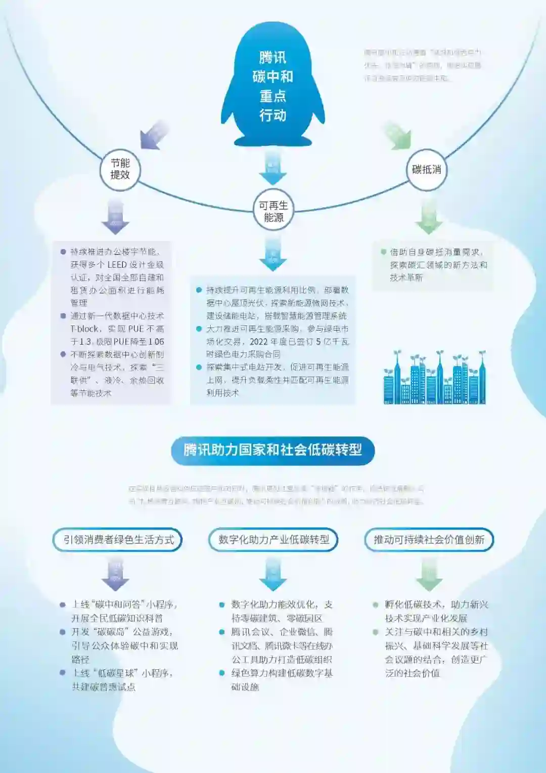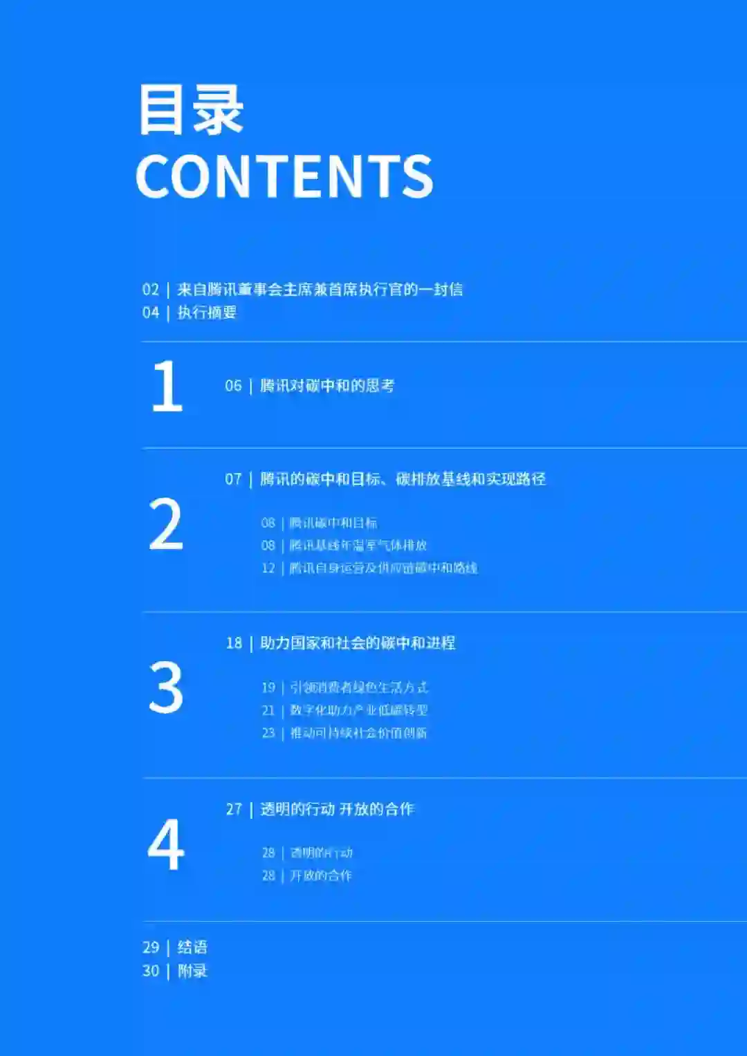 近几年,全球范围应对气候变化进程显著加速,将气候变化问题作为本世纪人类面临的最重大挑 战之一成为全球共识,2020 年 9 月我国作出“力争 2030 年前实现碳达峰、2060 年前实现碳中和” 的战略决策。当前,应对碳中和领域的挑战,在绿色转型中实现共同发展,已经成为国内国际面 临的重要共同任务。与此同时,推进实现碳中和不仅关系到能源结构转型,更涉及经济社会发展的全面变革,是一个 漫长、复杂、深远的过程,需要政策、技术、资金以及消费者意识等多个维度的共同努力。这些 让我们意识到,一方面必须立即开始行动,另一方面需要将其作为一项战略议题长期坚持。秉持“用户为本,科技向善”的使命愿景,腾讯实现自身碳中和责无旁贷。尽管互联网行业相比 电力钢铁等重工业,排放强度并不高,但我们的用能需求随着业务量的增长不可避免地会出现较 快增长预期,而我们也看到通过快速、科学的行动尽早实现业务增长和碳排放脱钩的可能。通过过去一年的实践与探索,我们提出了腾讯的碳中和规划,在确立科学的碳中和目标和切实可行的 行动路线基础上,还在时间和范围上对自己提出了更高的要求。碳中和关涉经济社会发展的全面转型,需要各行各业参与其中并采取行动。作为助手、连接器, 除了完成自身的碳中和目标外,我们也希望主动承担起助力社会低碳转型、扶持新兴低碳技术的 使命和义务。数字化技术可以从效率提升、广泛连接等不同的角度,促进产业升级以及低碳经济 发展;腾讯生态内连接着最广大的消费者,他们是低碳生活理念的践行者,他们的努力将直接或 间接地推动社会低碳转型;与此同时,新兴低碳技术本身的发展也需要研发资金的长期支持和产 业环境的孵化,这些都是我们助力全社会低碳转型的重要方向。