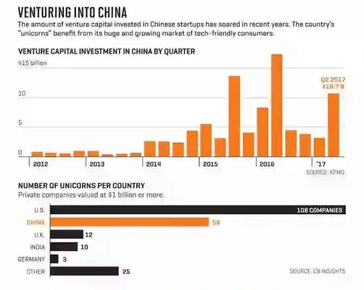图表显示了涌入中国的风险投资状况和独角兽数量
