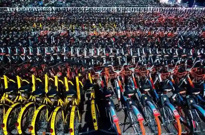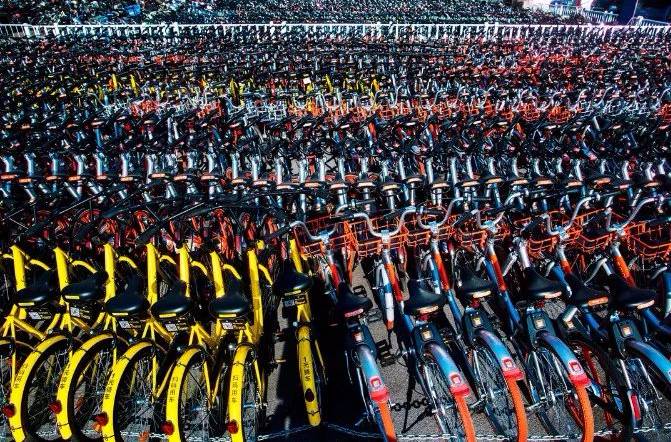 摩拜以及ofo等快速发展的创业公司出产的成排的共享单车