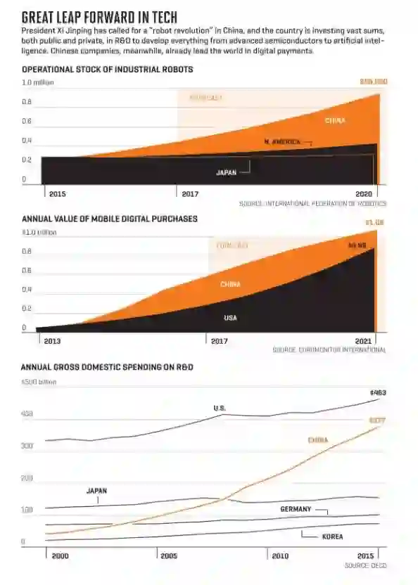 如华为技术创始人任正非,去年的专利申请比世界上任何一家公司都多。而负责腾讯微信团队开发的张小龙,他所开发的这款智能手机应用程序,允许其9亿用户通过它聊天,购物,付款,玩游戏以及做其他任何事情。北京的搜索引擎公司百度首席执行官李彦宏表示,明年自动驾驶汽车将准备在中国销售。