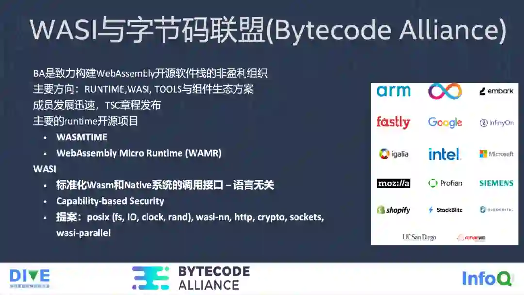 字节码联盟目前 Runtime 开源项目主要有两个,一个是 WASMTIME,另外一个是 WebAssembly Micro Runtime,WebAssembly Micro Runtime 最早是由 Intel 开发的,在 2019 年贡献给字节码联盟了。目前除了 Intel 持续在上面开发之外,有很多企业如亚马逊、索尼、蚂蚁、小米、阿里巴巴在上面也贡献了很多特性和功能。
