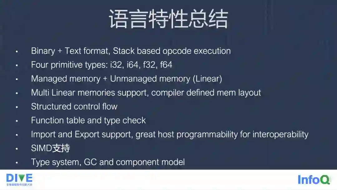 我们这里首先对 Wasm 语言的特性做一个总结。它包含了二进制和文本的两种格式,它的执行模式是基于 Stack 的一种执行模式。它定义了四种基本的数据类型,就是 32 位、64 位的整数,32 位和 64 位的浮点精度。