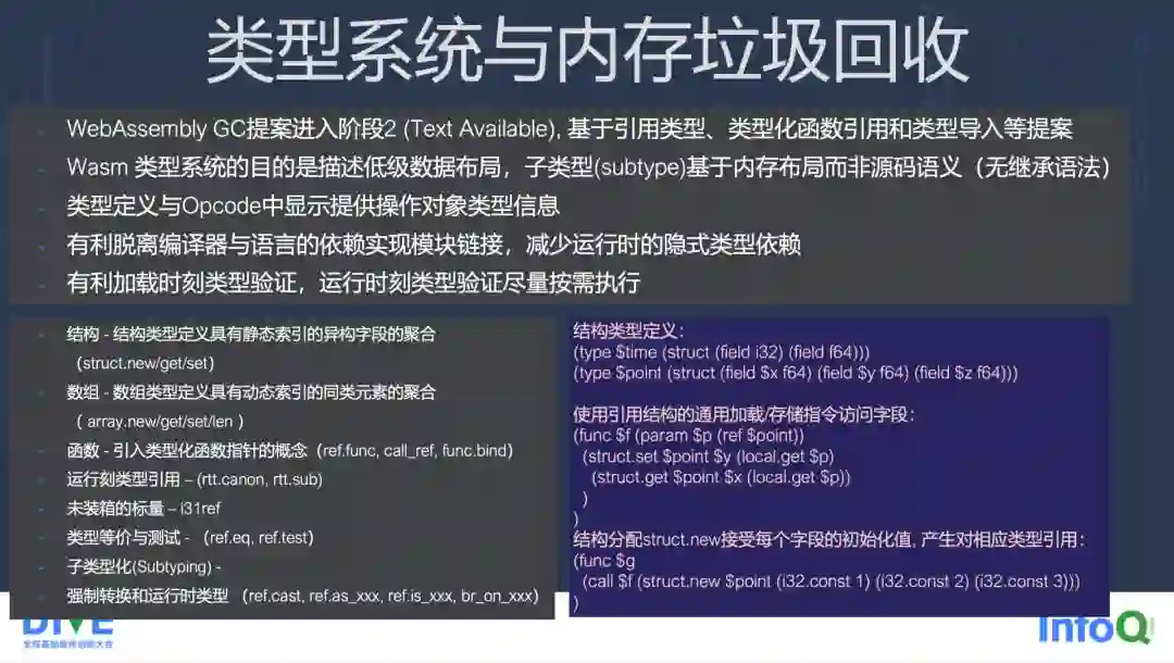 刚才在字节码里面已经看到类型信息,它所有的函数都是有一个类型的定义,而且类型是有从 0 开始的索引编号。垃圾回收特性 (GC) 目前进入了文本可用的提案 2 的阶段,它包含着一系列的所依赖的 Spec,如引用类型 Reference Type,还有就是类型化函数引用 Typed Function Reference,类型导入这些提案等。