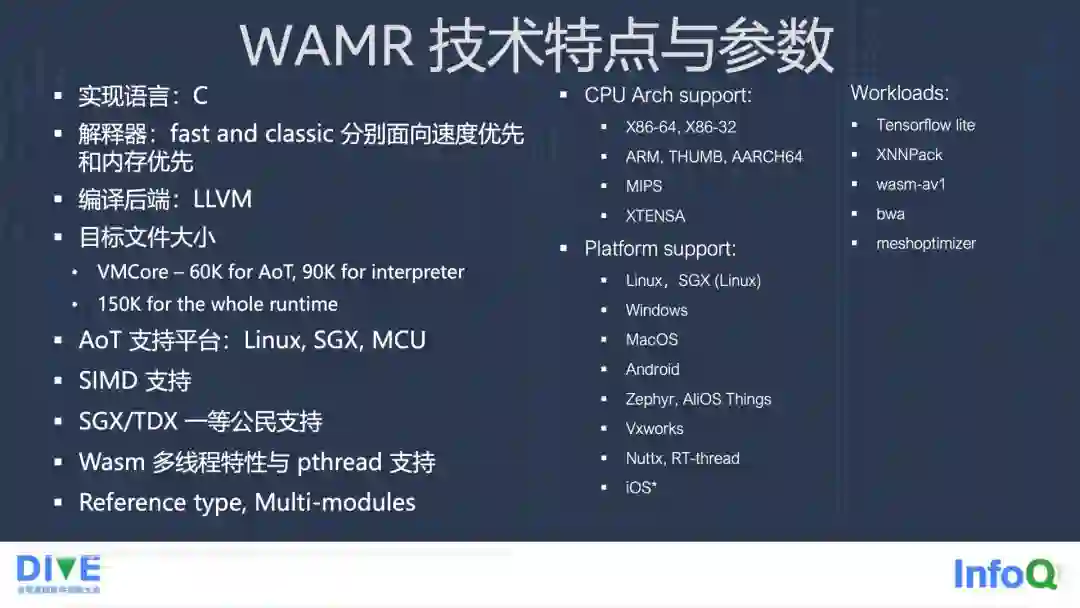 WAMR 支持 JIT 和 AoT,JIT 和 AoT 目前是基于 LLVM 框架来实现的,整个 Runtime 的特点就是说它的 VMCore 很小,在 100K 以内,但同时它的性能又非常好。一方面借助 LLVM 这个非常好的编译框架,它的性能和 GCC 相比,根据不同的 Workload,从 60%、70%、80%、90%,甚至还有快过 GCC 原生编译的。另外它的 AoT 也是个很特色的设计,因为它有个完全自定义的 AoT 的加载机制,不依赖于系统的 Loader,它可以在很多的平台上都可以用,像 Linux 或者 SGX 环境,甚至像一些 MCU 上的嵌入式操作系统,也可以使用 AoT 的 Loader。另外它支持向量化计算,对于 Intel SGX 和 TDX 这种安全的执行环境有非常良好的支持。它还支持多线程、pthread、Reference type 和 Multi-modules 等丰富的特性,欢迎大家能花点时间了解体验下。