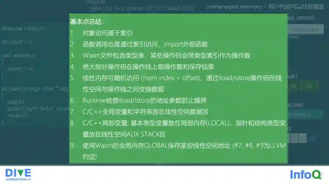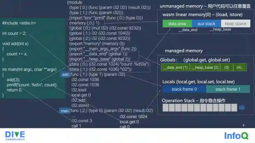 我们使用一个例子来介绍 Wasm 的字节码和内存模型。在最左边是一段 C 语言的源码,这段代码会被编译到屏幕中间 WebAssembly 的字节码,右边展示在运行态的内存布局。左边的源码定义了一个全局变量 count,一个函数 add,add 会把输入参数 x 再加上 count,把结果更新到 count。