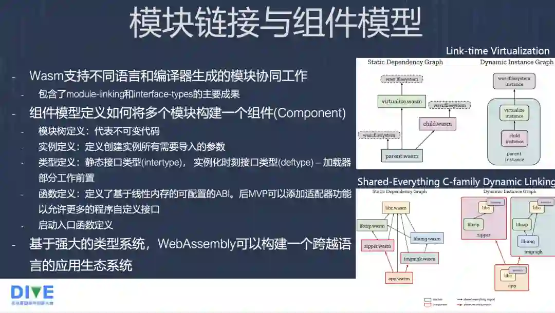 模块链接与组件模型,目前这块的规范也在制定之中。首先需要标准化模块之间的链接,module-linking 的 spec 定义了一些典型的链接的模式。屏幕右边是两种比较典型的链接模式,上面这种叫 Link-time Virtualization,描述了所有 WASM 模块之间的静态依赖,比如说 parent,它也会去访问 WASI 文件系统,child 也会访问文件系统,virtualize 模块也会访问。我们并不想用 child 能够真的去访问物理的内存,可以引入 Virtualization 模块,它会向 child 提供 WASI Interface,所以 child 说需要去访问 WASI Interface,实际上是让 Virtualization 去给它导出一个让它使用,Virtualization 模块中间会做一些转换或者一些检查,它会去实际访问真正的 File System 模块,这样对于 child instance 它所看到是个虚拟化的接口,这叫 Link-time Virtualization。