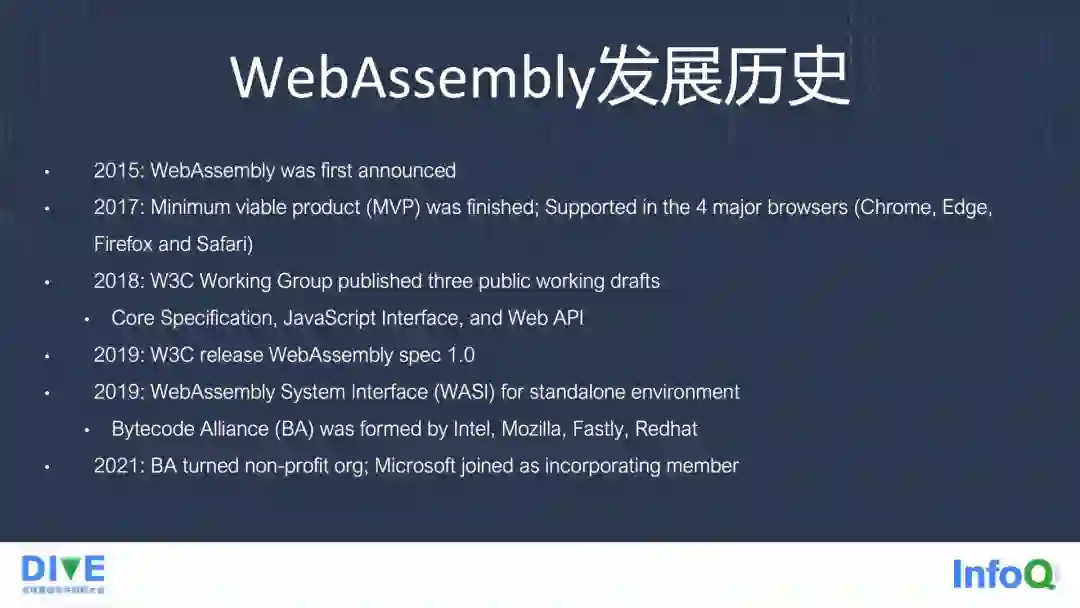 在 2015 年,WebAssembly 第一次被对外公布。2017 年 MVP (Minimal Viable Product) 规范完成,并在 Chrome、Edge、Firefox 和 Safari 等四个主流的浏览器上得到支持。到了 2018 年,W3C 工作组发布了三个公开的 Drafts,包含 WebAssembly 的 Core Specification、JavaScript Interface 和 Web API。在 2019 年,WebAssembly spec 1.0 正式发布。同年 10 月份左右,Bytecode Alliance (BA) 由 Intel、 Mozilla、Fastly、Redhat 四家公司成立,主要的目标是构建与推广基于 WebAssembly 以及 WebAssembly System Interface 的安全软件栈。到 2021 年,BA 正式成为非盈利性的组织,微软也加入成为协作会员,到目前已经有大概 30 多家的会员,发展情况非常良好。
