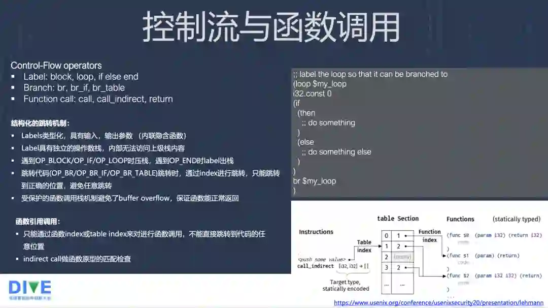 Wasm 的流控是一个结构性的流控。它的函数调用需要使用函数表 (Function table)。如果和基于 C 语言编译的机器指令相比,机器指令里可以直接跳到目标的物理地址,这里是一个间接地址。Wasm 的函数调用操作码后面都跟着一个索引号,这个索引就是目标函数在 Function table 里面的索引值。如果是间接调用函数,则需要做函数类型检查。