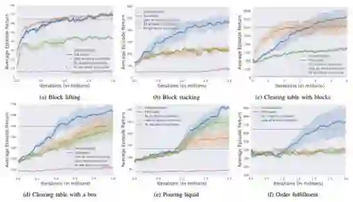 为了解决这些挑战,本论文研究者提出的方法将模仿学习和强化学习结合起来,构建一个统一训练框架。该方法以两种方式利用演示数据:使用混合奖励,基于生成对抗模仿学习将任务奖励与模仿奖励结合起来;使用演示轨迹构建状态的课程(curriculum),以在训练中初始化 episode。因此,该方法解决了全部六个任务,这些任务单凭强化学习或模仿学习都无法解决。