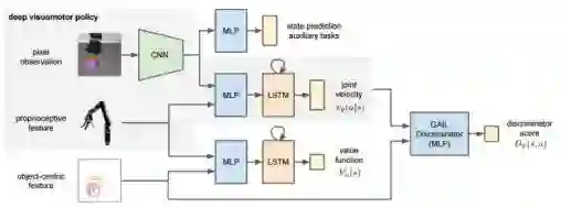 本研究旨在为机器人控制任务学习深度视觉运动策略。该策略使用 RGB 摄像头观测结果和本体特征(proprioceptive feature)向量描述关节位置和角速度。这两种感官模态在真实机器人上同样可用,因此研究者进行仿真训练,并将习得的策略在不修改的情况下迁移至机器人。图 2 是模型概览。深度视觉运动策略使用卷积神经网络编码观测像素,使用多层感知机编码本体特征。这两种模块中的特征被级联并传输至循环 LSTM 层,然后输出关节速度(控制)。整个网络以端到端的方式进行训练。研究者首先简要介绍了生成对抗模仿学习(GAIL)和近端策略优化(PPO)的基础知识。该模型基于这两种方法扩展而来,提升视觉运动技能。
