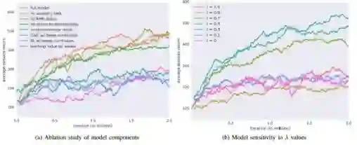 图 4. 论文提出的强化与模仿学习模型和基线学习效率的对比。该图展示的是 5 次不同随机种子运行的平均值。所有策略使用同样的网络架构和超参数(λ 除外)。