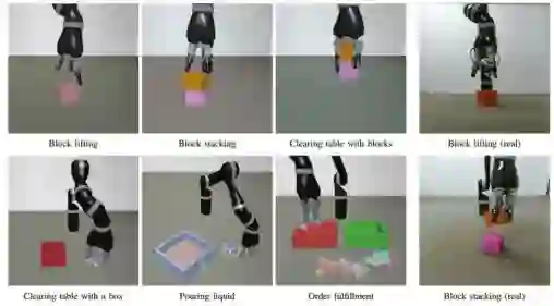 图 1. 研究者提出的机器人学习流程。研究者使用 3D 运动控制器收集某项任务的人类演示。本论文提出的强化学习和模仿学习模型利用这些演示促使模拟物理引擎的学习。然后执行 sim2real 迁移,将习得的视觉运动策略迁移至真正的机器人。