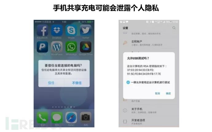 在公共场合使用免费充电桩充电时,许多人都不太注意手机上“是否开启USB调试”或“是否信任该设备”的提示信息,如果用户点击“是”或“信任”按钮,就相当于让充电设备掌握了手机的绝对控制权,黑客就可以随意窃取手机里的信息。