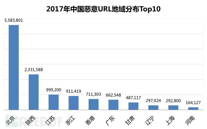 报告期内,北京市恶意网址(URL)总量为558万个,位列全国第一,其次是陕西省233万个,以及江苏省100万个,分别为二、三位。