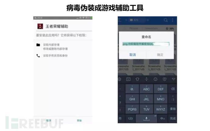 2017年6月,一款冒充“王者荣耀辅助工具”的勒索病毒,通过PC端和手机端的社交平台、游戏群等渠道大肆扩散,威胁几乎所有Android平台,设备一旦感染后,病毒将会把手机里面的照片、下载、云盘等目录下的个人文件进行加密,如不支付勒索费用,文件将会被破坏,还会使系统运行异常。