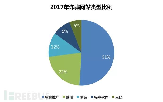 报告期内,恶意推广类诈骗网站占51%,位列第一位,其次是赌博类诈骗网站占22%,情色类诈骗网站占12%,分别为二、三位。