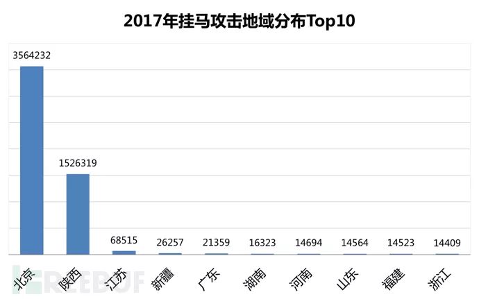 2017年瑞星“云安全”系统共拦截挂马网站攻击540万余次,北京市受挂马攻击356万次,位列第一位,其次是陕西省受挂马攻击153万次。