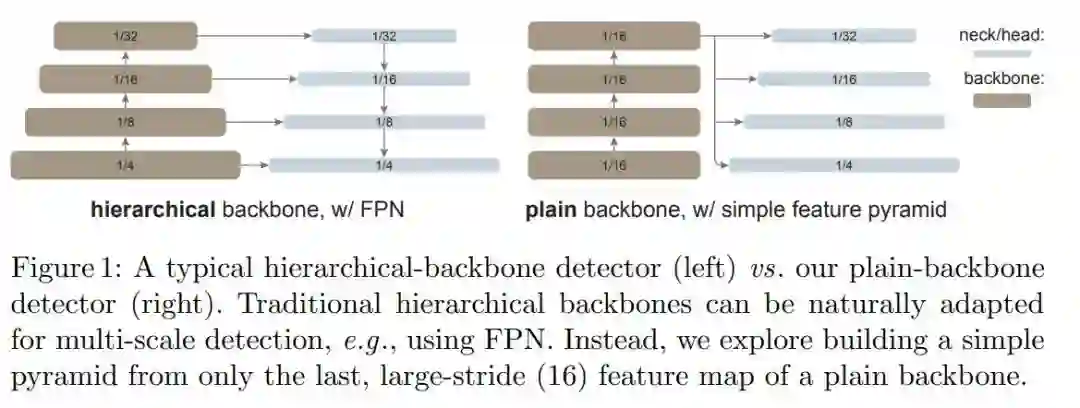 当前的目标检测器通常由一个与检测任务无关的主干特征提取器和一组包含检测专用先验知识的颈部和头部组成。颈部/头部中的常见组件可能包括感兴趣区域(RoI)操作、区域候选网络(RPN)或锚、特征金字塔网络(FPN)等。如果用于特定任务的颈部/头部的设计与主干的设计解耦,它们可以并行发展。从经验上看,目标检测研究受益于对通用主干和检测专用模块的大量独立探索。长期以来,由于卷积网络的实际设计,这些主干一直是多尺度、分层的架构,这严重影响了用于多尺度(如 FPN)目标检测的颈/头的设计。