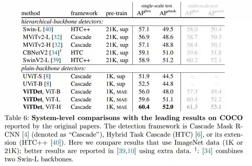 探索仅使用普通、非分层主干的目标检测器。如果这一方向取得成功,仅使用原始 ViT 主干进行目标检测将成为可能。在这一方向上,预训练设计将与微调需求解耦,上游与下游任务的独立性将保持,就像基于 ConvNet 的研究一样。这一方向也在一定程度上遵循了 ViT 的理念,即在追求通用特征的过程中减少归纳偏置。由于非局部自注意力计算可以学习平移等变特征,它们也可以从某种形式的监督或自我监督预训练中学习尺度等变特征。