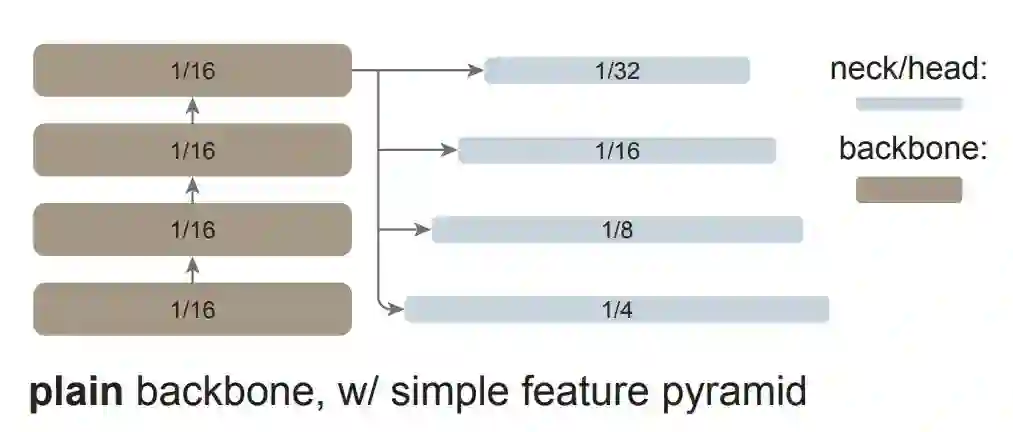 在这项研究中,他们的目标不是开发新的组件,而是通过最小的调整克服上述挑战。具体来说,他们的检测器仅从一个普通 ViT 主干的最后一个特征图构建一个简单的特征金字塔(如图 1 所示)。这一方案放弃了 FPN 设计和分层主干的要求。为了有效地从高分辨率图像中提取特征,他们的检测器使用简单的非重叠窗口注意力(没有 shifting)。他们使用少量的跨窗口块来传播信息,这些块可以是全局注意力或卷积。这些调整只在微调过程中进行,不会改变预训练。