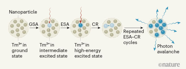 光子雪崩的机制。在含有8摩尔%铥离子(Tm3+)的纳米晶体中,可以发生一种被称为光子雪崩的现象。这些离子最初处于它们的地态,但会微弱地吸收来自激光的光(红色箭头)。这种地态吸收(GSA)促使离子进入中间激发态。受激离子对激光的吸收比地态离子强烈得多,这种受激态吸收(ESA)产生了一个高能态的离子。高能态的离子与相邻的地态离子分享其能量,这个过程称为交叉弛豫(CR),从而产生两个处于中间激发态的离子。进一步的ESA和CR循环使中间激发态离子的数量成倍增加,这些离子经过ESA形成高能态离子。这些离子最终放松回到其基态,发射出雪崩式的光子(蓝色箭头)。来源:Nature