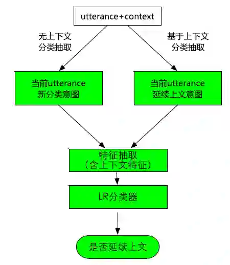 在表1 中,我们展示了一个例子,如果不看上下文,无法确定「后天呢」的意图。为了解决这个问题,在系统中我们设计了意图排序模块,其流程如图 10 所示。对于用户输入的 utterance,一方面先利用分类抽取模型去判定意图并做抽取;另一方面,直接继承上文的意图,然后根据这个意图做属性抽取。这两个结果通过特征抽取后一起送入一个 LR 分类器,以判定当前 utterance 是应该继承上文的意图,还是遵循分类器分类的意图。如果是继承上文意图,那么可以把这个意图及其属性抽取结果作为最终结果输出;如果是遵循分类器分类的结果,那么可以把各个结果按照分类器分类的置信度排序输出。