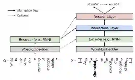 在阅读理解的方法上,目前针对斯坦福大学的数据集 SquAD,有大量优秀的方法不断涌现,比如 match-LSTM[15]、BiDAF[16]、DCN[17]、 FastQA[18] 等。文献 [18] 给出了目前的通用框架,如图 11 所示,主要分为 4 层:① Word Embedder,对问题和文档中的词进行 embedding;② Encoder,对问题和文档进行编码,一般采用 RNN/LSTM/BiLSTM; ③ Interaction Layer(交互层),在问题和文档之间逐词进行交互,这是目前研究的热点,主流方法是采用注意力机制(attention);④ Answer Layer(答案层),预测答案的起始位置和结束位置。