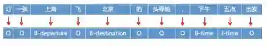 属性抽取问题可以抽象为一个序列标注问题,可以以字为单位进行序列标注,也可以以词为单位进行序列标注,如图 8 所示为以词为单位进行序列标注的示例。在这个例子中包含 departure、destination 和 time 三个待标注标签;B 表示一个待标注标签的起始词;I 表示一个待标注标签的非起始词,O 表示非待标注标签词。