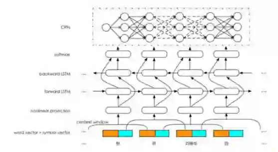 在输入层,我们做了三部分工作:① 采用了分布式表示(word vector)和符号表示(symbol vector)融合的方式,有效利用了分布式的上下文学习能力和符号的抽象知识表示能力;② 采用了局部上下文窗口(localcontext window),将窗口内的词的表示拼接在一起送入一个非线性映射层,非线性映射具有特征学习和特征降维的作用;③ 采用了 FastText [8] 进行 word embedding 的学习,可以有效解决 OOV 的问题。