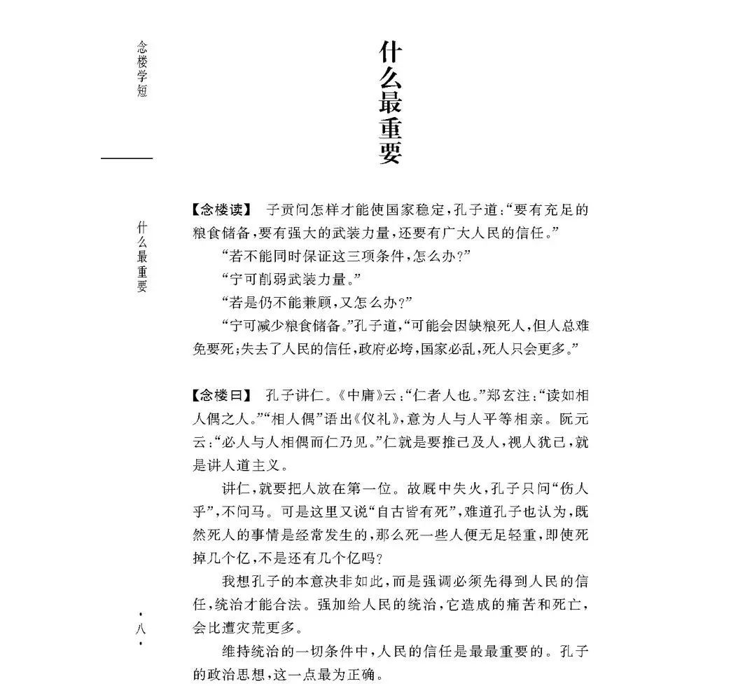 《念楼学短》本书每篇文章的小标题,都蕴含了作者的独特创造与智慧。比如:《论语·颜渊》“子贡问政”这一篇的小标题,就是“什么最重要”。