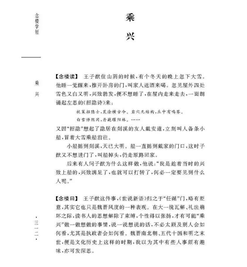 比如选自《世说新语》一书的《雪夜访戴》一篇,就讲述了名士王子猷雪夜访友,乘兴而行,兴尽而返的故事。