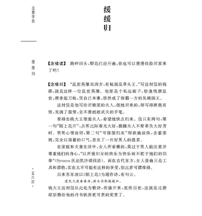 这封信是吴越国王钱镠写给回娘家的夫人,催她快点归来。信只有两句,第一句“陌上花开”,点明此际春光大好,提醒夫人不要辜负大好春光。