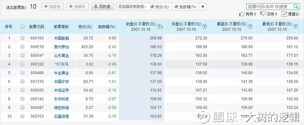 由于2007年业绩牛的推动,产生了共十只100元以上的股票,分别为中国船舶、贵州茅台、山东黄金、*ST天马、中金黄金、中国平安、中信证券、东华科技、驰宏锌储、石基信息,主要以有色等资源股为主。当泡沫结束,就知道谁在裸泳了,于2008年10月28日熊市最低点1664点百元股全部被消灭。