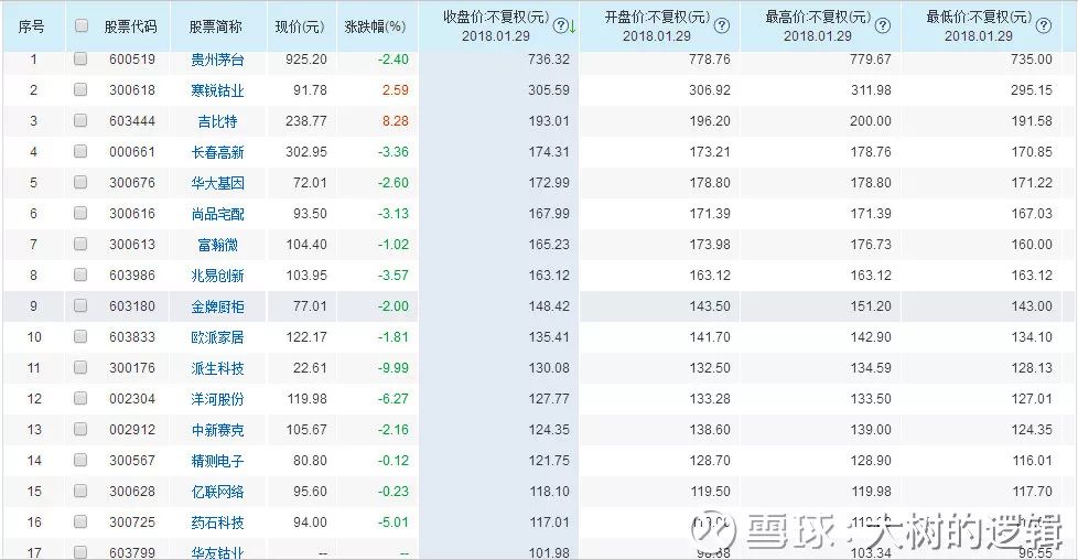 2017年的价值牛又催生了共18只百元股,其中新进了尚品宅配、金牌橱柜、欧派家居等家居类企业,这与2017年家居上市元年脱不了关系,当然了也少不了吉比特、派生科技等概念股、更少不了消费白马贵州茅台。
