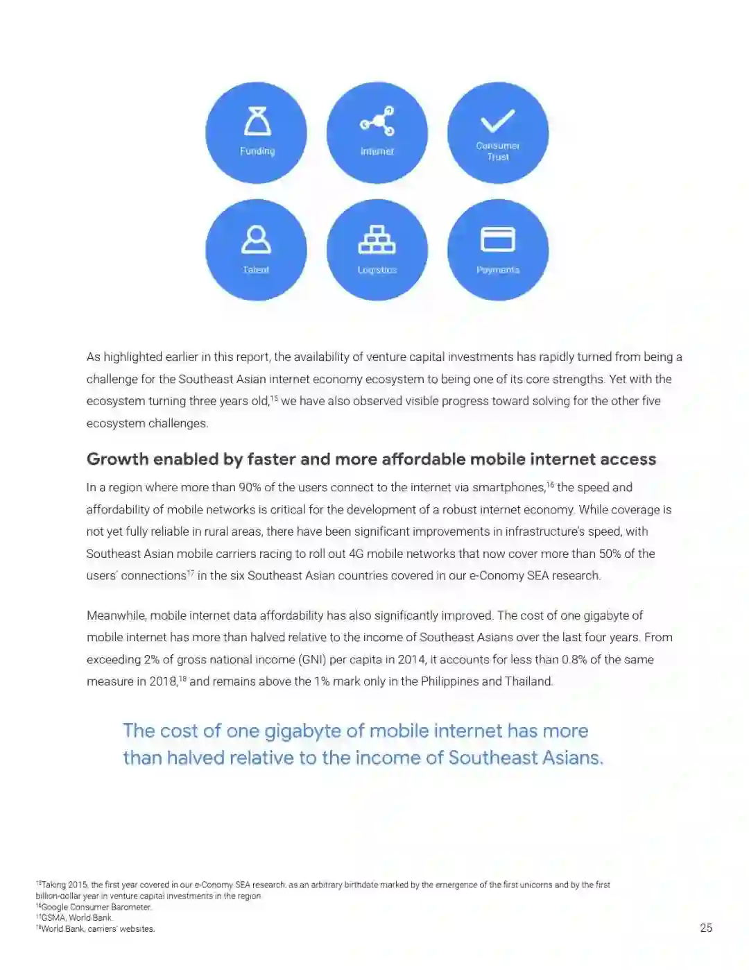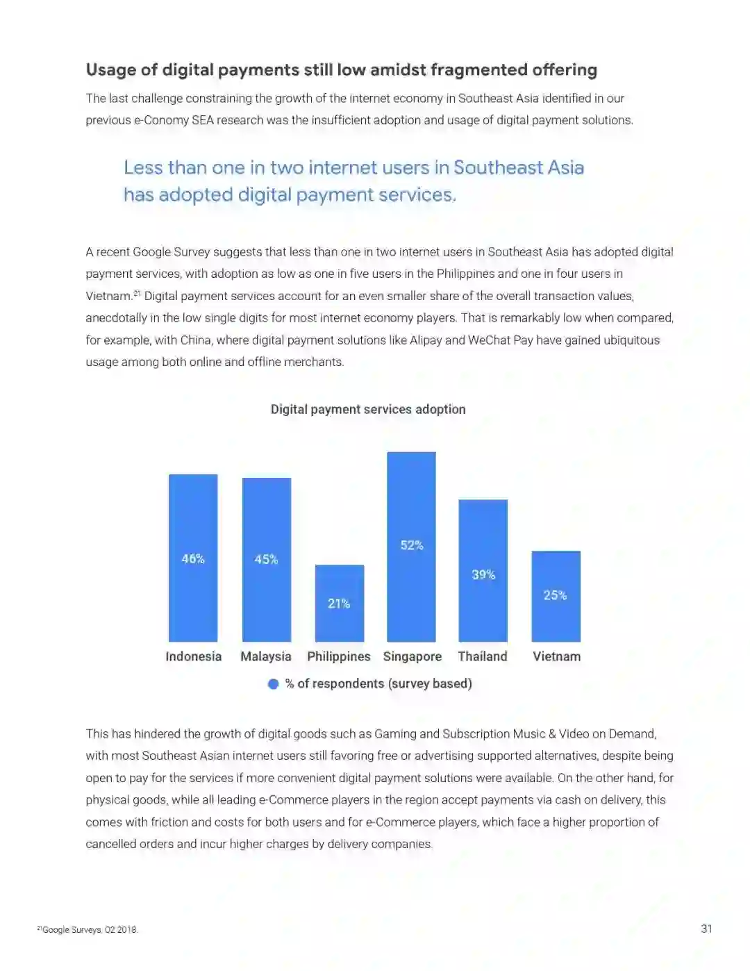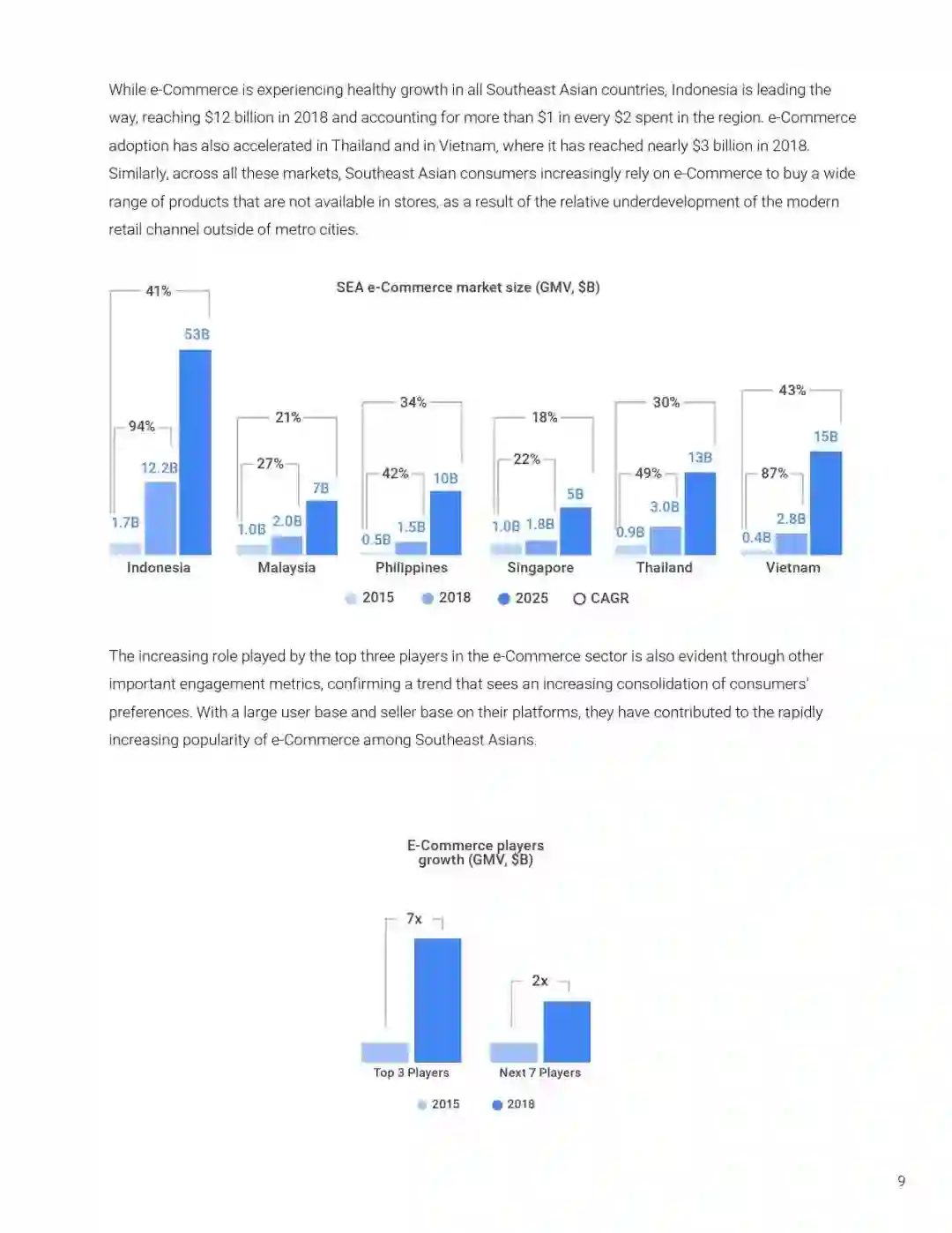 电子商务是东南亚网络经济增长最快的行业,2018年达到230亿美元,到2025年将超过1000亿美元。该地区三家最大的电子商务运营商为Lazada、Shopee和Tokopedia,对该地区电子商务发展至关重要。