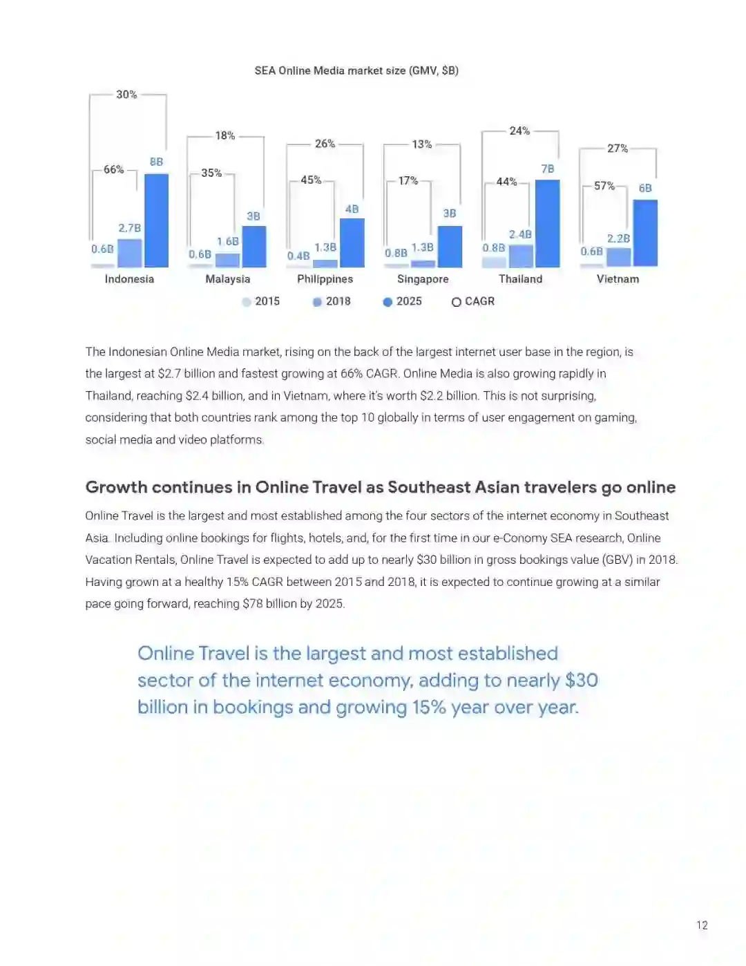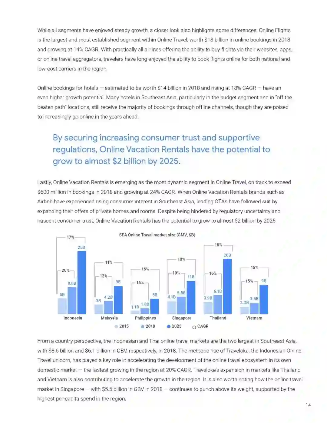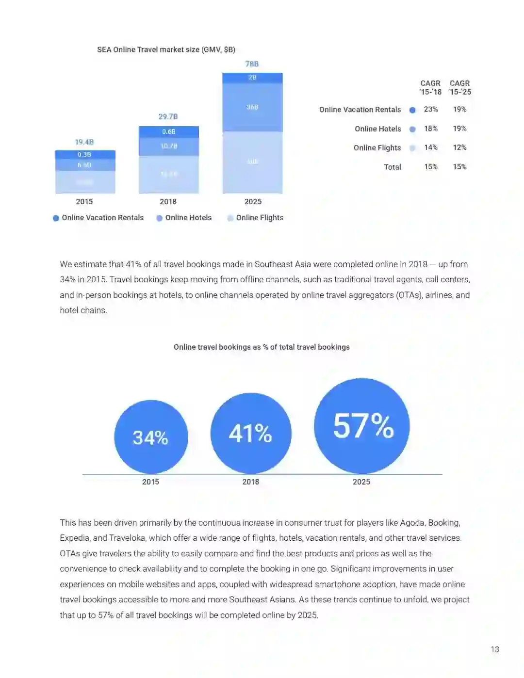 在线旅游是东南亚网络经济中最大也是最成熟的行业,每年订购额接近300亿美元,年增长15%。到2025年该地区在线度假租赁有望增长至20亿美元。