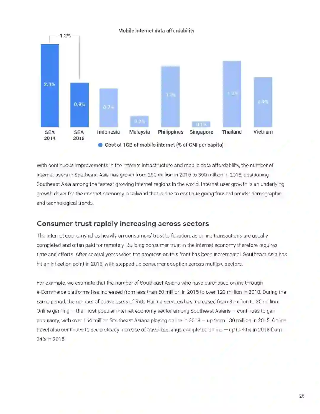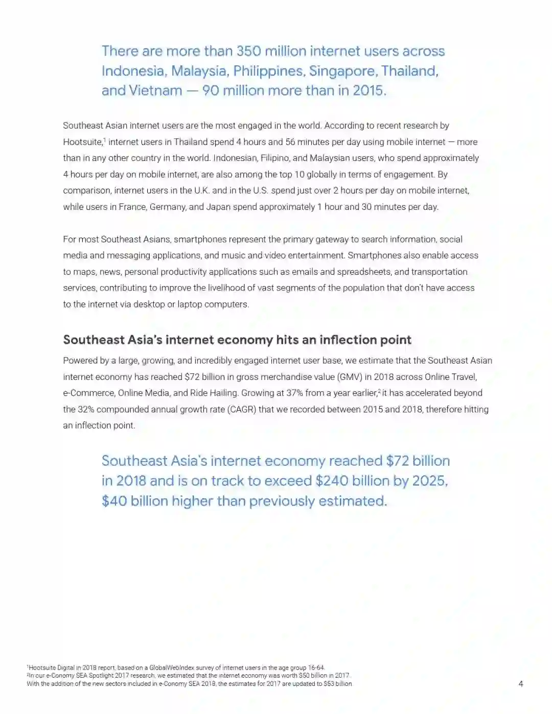 2018年6月,印度尼西亚、马来西亚、菲律宾、新加坡、泰国和越南网民数量超过3.5亿人,比2015年增长了9000万网民,其中超过90%主要使用智能手机上网。同时,东南亚网民也是在线时长最长的,例如泰国网民每天花4小时56分钟访问移动互联网,远超过地球上的其他国家。