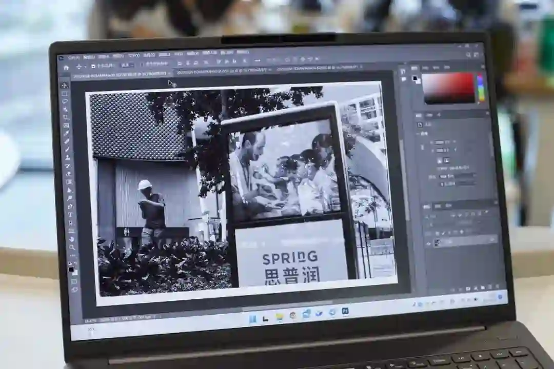 在收到小新 Pro 16 后的第一天,我就将它带进了日常工作。如很多读者朋友所知,我有打开应用之后不关闭的习惯,而且浏览器里也经常堆积着大量标签,但对于小新 Pro 16 的来说,即使同时将《PowerPoint》《Word》《Photoshop》和浏览器等都放在前台同时运行,也完全无法对电脑构成性能压力。尤其在多应用同时开启、频繁切换,或者 PS 批量导入大文件时,都能明显感受到 PCIe 4.0 的 SSD 和 LPDDR5-6400 组合带来的顺滑。