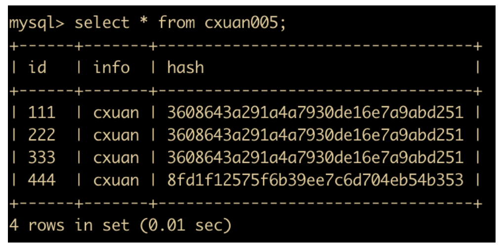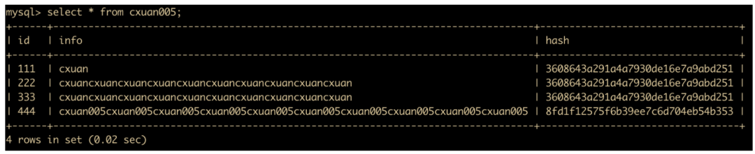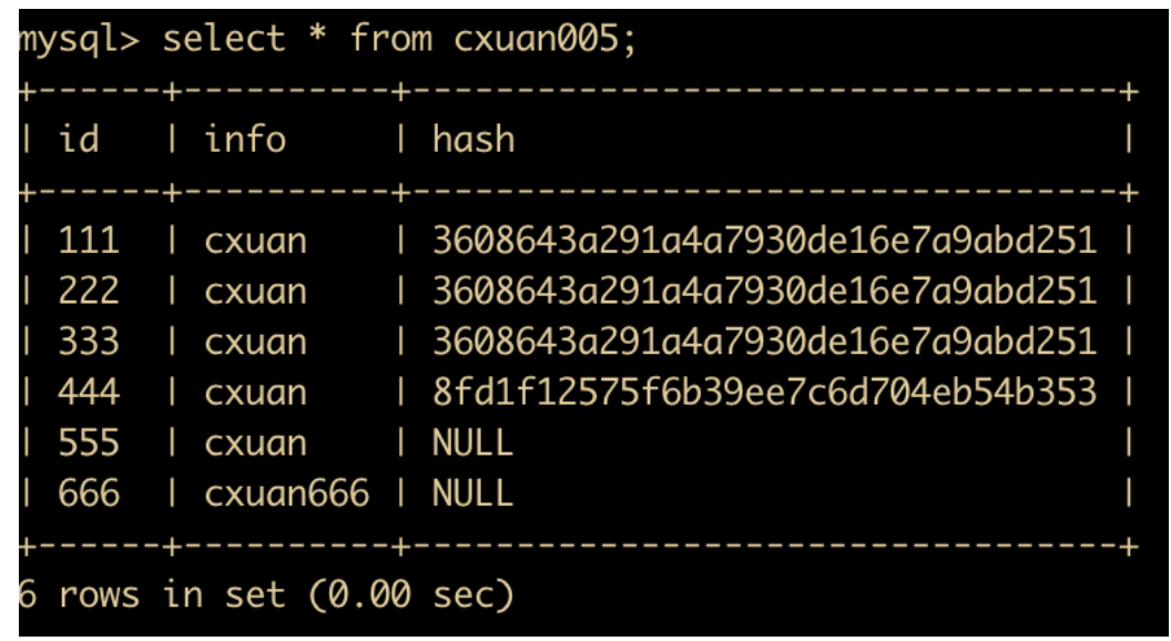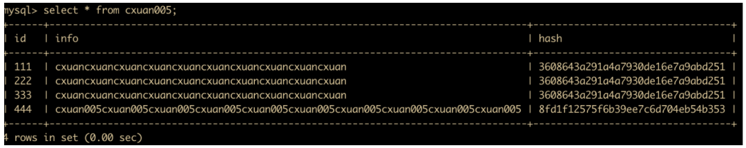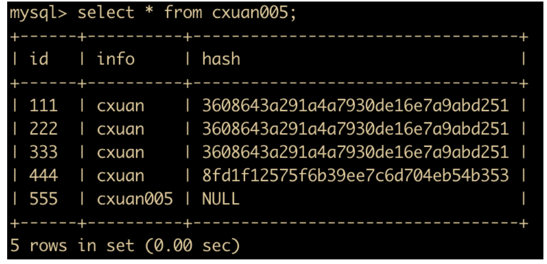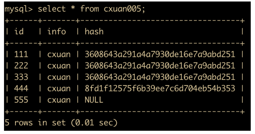 insert into cxuan005(id,info) values (555,'cxuan005'); # 插入一条数据