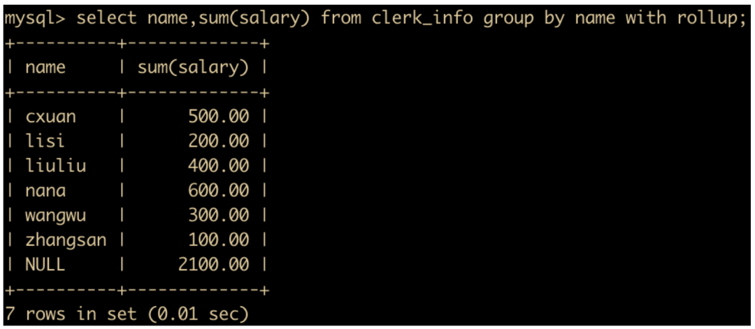 select name,sum(salary) from clerk_info group by name with rollup;