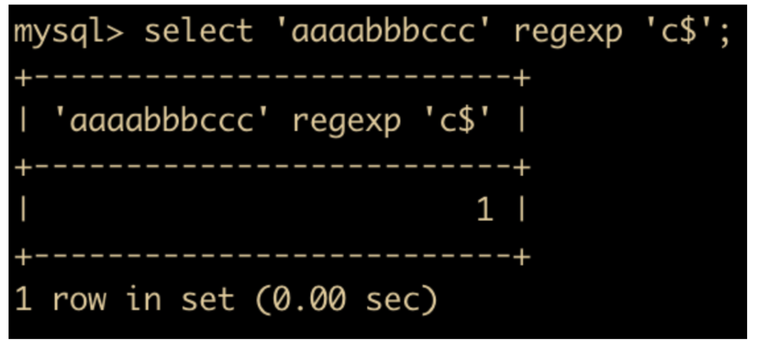 select 'aaaabbbccc' regexp 'c$';