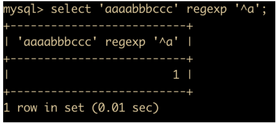 select 'aaaabbbccc' regexp '^a';