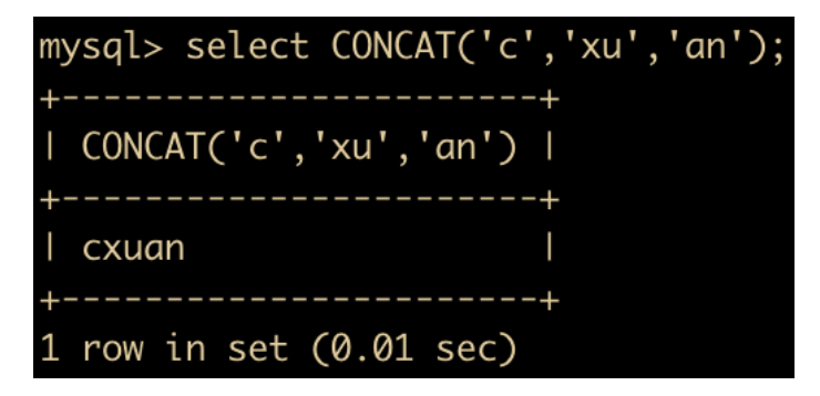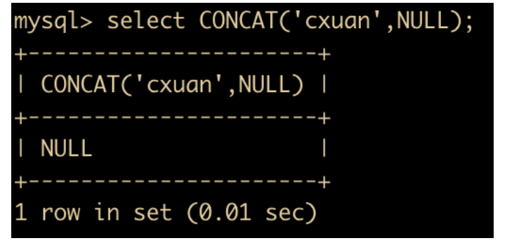 拼接成为了一个字符串,另外需要注意一点,任何和 NULL 进行字符串拼接的结果都是 NULL。