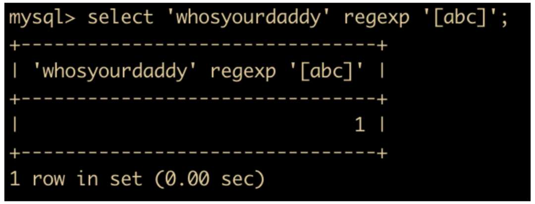 select 'whosyourdaddy' regexp '[abc]';
